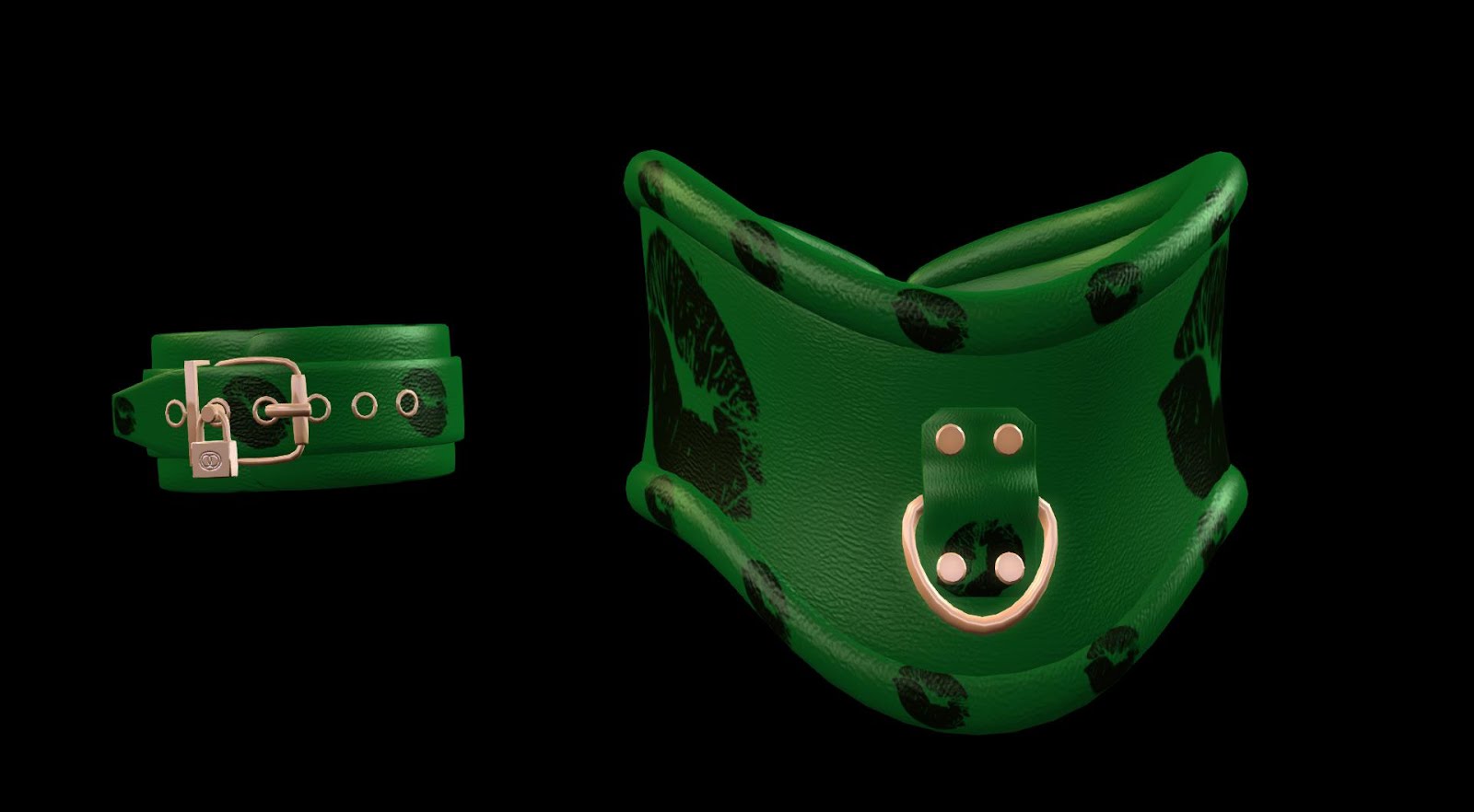Of course black might not be your color of choice... Fret not, you can customize the cuffs and collars entirely. You can choose whether to use materials, in which case they will look realistic with a dynamic shine that moves with the camera, or not to use materials, meaning you can use any of the static textures (another name for "baked lighting", meaning the light is directly "painted" onto the texture, it was the old way of rendering shine in SL before materials). See for yourself :